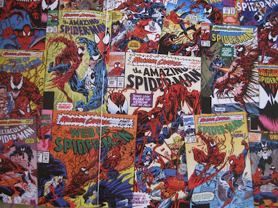 Mas foi em 1984, na edição 252 que apareceu um dos meus vilões favoritos de todos os tempos, com uma idéia de fã reformulada começou nesse ano a primeira de muitas sagas do uniforme negro, com a chegada do simbionte na Terra. E foi em 1988 que a segunda saga do simbionte foi escrita, onde finalmente Eddie Brock assumiu o uniforme e se tornou o tão famoso Venom. E seu primo de primeiro grau apareceu 4 anos depois em The Amazing Spider-Man 361, mostrando uma sede de sangue jamais vista nos quadrinhos do Aranha antes, foi com muita morte e muito sangue que Carnificina foi apresentado ao publico.