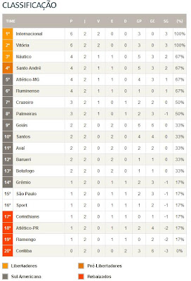 Apenas dois times continuam com 100% de aproveitamento depois de apenas 2 jogos, Inter e Vitória que bateram o meu Palmeiras por 2×0 (oooooo tristeza!) e o Sport por 1×0 (iiiii… agora o Sport desanda!) respectivamente.