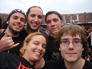 aHUAHuahAUAHuAhaUahUa o Zenon deu uma de espertão e deu um olé na galera que auxiliava o povo pros lugares, segundo ele ninguém olhava o setor do convite, looogo o simpático narigudo apareceu na pista meo!! Depois de um tempinho o cara que viria a se tornar a figura do encontrão logo menos ligou pro Z…Jeet!! Ele estava do outro lado da torre de iluminação com um primo, demos as coordenadas e nada do garoto aparecer, até que o Zenon se emputeceu e foi lá encontrar o cara aHuAHauahuahuahaUahuhua. Estavamos Eu,Pin, Z e Jeet…ficamos lá papeando até o tempo passar, sentamos a bunda no chão e putz…dava 22:00hs mas num dava 20:30 pro Sepultura subir no palco…todo mundo sabe o Sepultura abriu de novo o show do Metallica em São Paulo né? Quando eu fui em 1999, foi a mesma coisa e apanhei pra cacete, puta doideira…hoje mais encorpadinho, mais fortinho eu estava pronto pra agüentar a porrada! Foi enfim escurecendo, liguei pro meu fiel escudeiro James perguntando se ele vinha e tal…passou um pouco mais de 30min, eu percebo uma clareira se abrindo na multidão um pouco mais atrás da gente. A galera ia abrindo espaço como se fosse atropelada por alguma coisa absurdamente forte…eis que surge dali o nosso amigo grandalhão James! Caaaaara estavamos completos agora pra curtir o show!! Tínhamos o Titã conosco, agora estava suave. Yeah!! O Sepultura subiu ao palco o dia ainda estava claro, e abriu o show com uma linda canção de ninar…