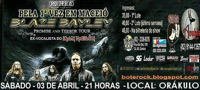 Blaze Bayley,ex vocalista do Iron Maiden,tem uma maravilhosa carreira solo do qual você deve ter que conhecer! Considerado por muitas revsitas especializadas como um dos grandes cantores da cena atual,Blaze superou o preconceito da fase Maiden,a morte da esposa e gravadoras 171 com musicas sinceras,pesadas e de ótima qualidade.As datas da turne do novo cd Promisse e Terror estão aqui embaixo,vocês de todo Brasil acompanhem!