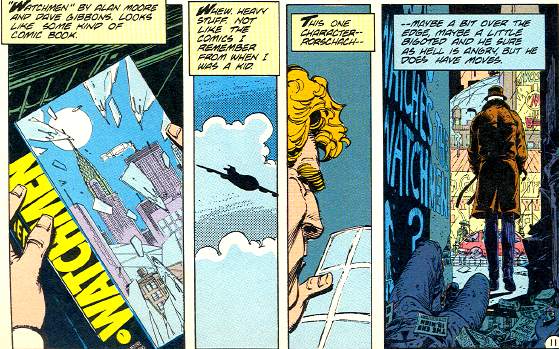 – Na edição 17 da série escrita por O´Neil, Vic Sage aparece lendo Watchmen e se interessa pelos métodos de Rorschach, chegando a tentar emular seu estilo de combate ao crime. Infelizmente, isso não dá muito certo e, prestes a ser morto por um criminoso por ter tentado agir como Rorschach, o Questão diz, como suas “últimas palavras” que “Rorschach sucks”.