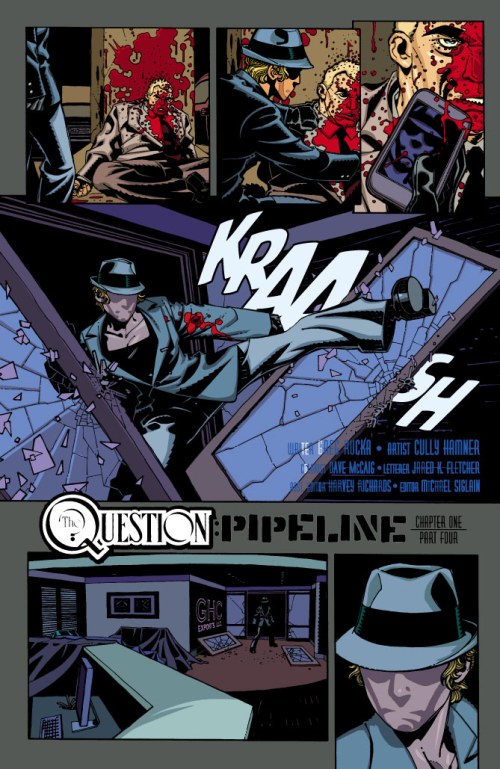 Em 2005 ele ganha uma mini série em 6 edições, tambem não publicada aqui, escrita por Rick Veitch e desenhada por Tommy Lee Edwards, com uma abordagem totalmente nova. Esqueça uns 80% do que voce sabe do Questão e introduza: o herói como um xamã urbano que “conversa com a cidade” (nessa série, a cidade de Metrópolis), a frustração de um plano de Lex Luthor contra o Super Homem, flertes com Lois Lane, o gás binário como um alucinógeno, transes em que ele “anda entre dois mundos” e por ai vai… Vale pela curiosidade, mas da mesma forma que essa versão apareceu do nada, sem explicação, também se foi, sem explicação, totalmente ignorada quando o Questão reapareceu na série 52.