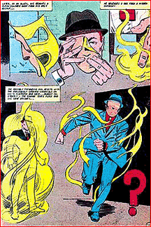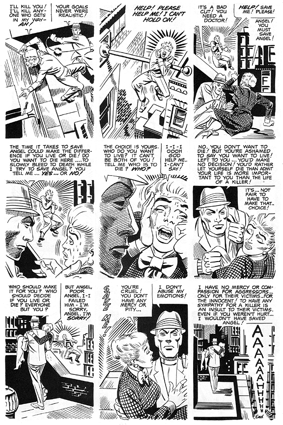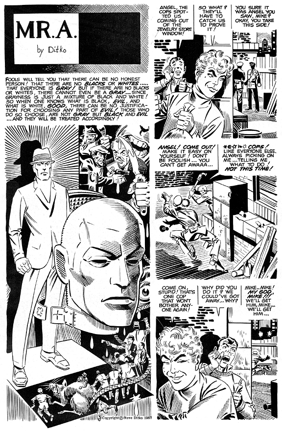 Dá pra notar que, ao escrever o Questão, Ditko tinha certa liberdade para fugir ao padrão de heróis da época e criar um vigilante que agia da forma como ele mesmo julgava que alguém assim deveria agir. Ainda assim, não era uma liberdade total e Ditko (participando de uma revista alternativa chamada Witzend onde havia uma ainda maior liberdade de criação) lançou, na mesma época, um personagem bastante similar, o Mr. A, basicamente uma versão mais “hardcore” do Questão, um personagem para quem não havia meio termo: ou algo era certo ou errado, ou era bom ou mal, ou era honesto ou corrupto e, se era errado, mal ou corrupto, devia ser combatido sem concessões. Clique nas imagens abaixo para ampliar e ler duas páginas da primeira estória do Mr A (em inglês).