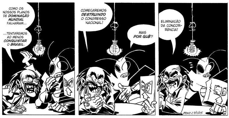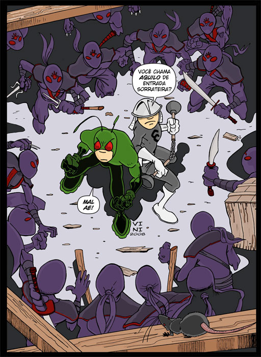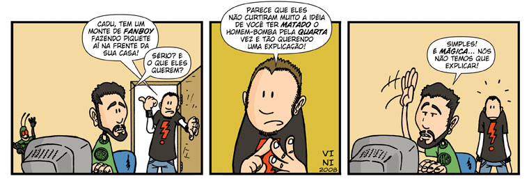 E na verdade eu nem curto fazer tiras. Exige uma boa habilidade de síntase que eu não possuo, por isso prefiro fazer HQs mais longas. Comecei a fazer as tiras do Homem-Grilo pois era uma forma mais rápida de atualizar o site do personagem enquanto o Ricardo não terminava de desenhar as HQs. As tiras também são mais práticas de serem lidas na Internet. Mas como eu disse, não é a minha praia. =)