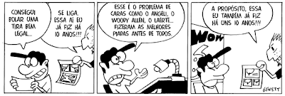 Benett – Não tenho uma maneira sistemática para fazer isso. Muitas vezes penso nas tiras durante minhas intermináveis horas de insônia e desenho tudo no dia seguinte. Outras vezes simplesmente sento com o papel em branco na minha frente e tento espremer uma ideia em 5 ou 10 minutos. Em outros tempos eu anotava tudo em folhas e jogava num canto, aí ia lá e escolhia as melhores e desenhava. E hoje tenho certeza que comecei a desenhar quadrinhos porque queria fazer as piadas que via no cinema, e a única maneira era através das tiras. Claro, havia toda a influência de Schulz e Johnny Hart, Angeli e Adão…mas a ideia mesmo eram as tiras que eu lia do Woody Allen, feitas pelo Stuart Hample.