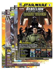 Star Wars, editora online, publicação mensal, R$ 7,90, um montão de páginas coloridas. A editora vende online as edições passadas e já lançou três encadernados das primeiras seis edições de seus principais títulos.