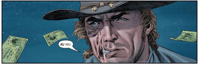 A arte também é “de matar” (boa essa tirada, hein, hein.. de matar.. Jonah Hex… bom, tentei. Rs…) graças ao brasileiro Luke Ross que manda muito bem no traço e na narrativa de 5 das 6 estórias. Luke (ou Luciano Queiroz, se preferir) caracteriza Jonah perfeitamente como Clint Eastwood (que realmente serviu de inspiração na criação do personagem, por John Albano e Tony DeZuniga) e ainda bota coadjuvantes inusitados em algumas estórias: Lima Duarte, Paulo Goulart, Matheus Natchergale (é quase um seriado global, rs), Christopher Walken e certamente tem muito mais gente que não identifiquei.