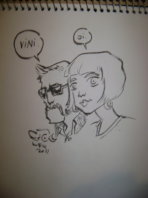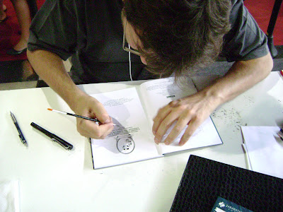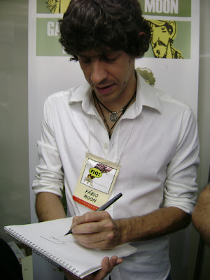 Apesar de muita gente parecer torcer o nariz pros gêmeos Gabriel Bá e Fábio Moon (talvez por uma certa postura que eles assumem perante os outros, meio que de ficarem na deles) eu, particularmente, acho o trampo dos caras muito bom e pelo menos comigo foram bem simpáticos. O Moon fez um puta desenho legal pra mim e ainda pudemos conversar bastante sobre quadrinhos + música como uma forma muito legal de se contar uma boa história. Ele inclusive deu dicas bem legais de materiais nesse “naipe”.