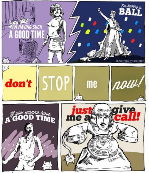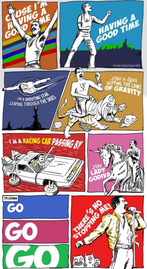 Já faz um tempinho que saiu uma arte em “quadrinhos” de uma música do Queen, “Don´t Stop Me Now”, que foi absurdamente ilustrada com a letra da música inteira!!