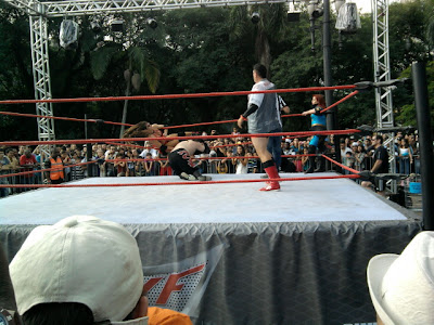 Por fim, óbvio que o casal brasileiro venceu, ganhou cinturão e tals. Particularmente não sou o maior fã de luta-livre, mas alguns movimentos que eles fazem são bem legais e são ótimo dublês, porque ao vivo não tem jogadinha de câmera nem nada. É no profissionalismo. Inclusive quando um dos malucos resolve jogar o outro pra fora do ringue, direto na calçada (sim, isso aconteceu como você pode ver abaixo).