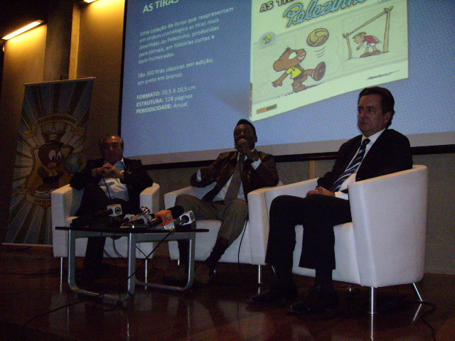 A coletiva atrasou um pouco, pois o Edson Arantes ficou preso no trânsito (como todos nós mortais, mas provavelmente em um carro bem mais legal), mas depois de alguma espera, eis que para delírio da platéia lotada de repórteres, jornalistas E eu, Mauricio de Sousa e Pelé subiram ao palco, acompanhados por Eduardo Severo Martin, o presidente da Panini.